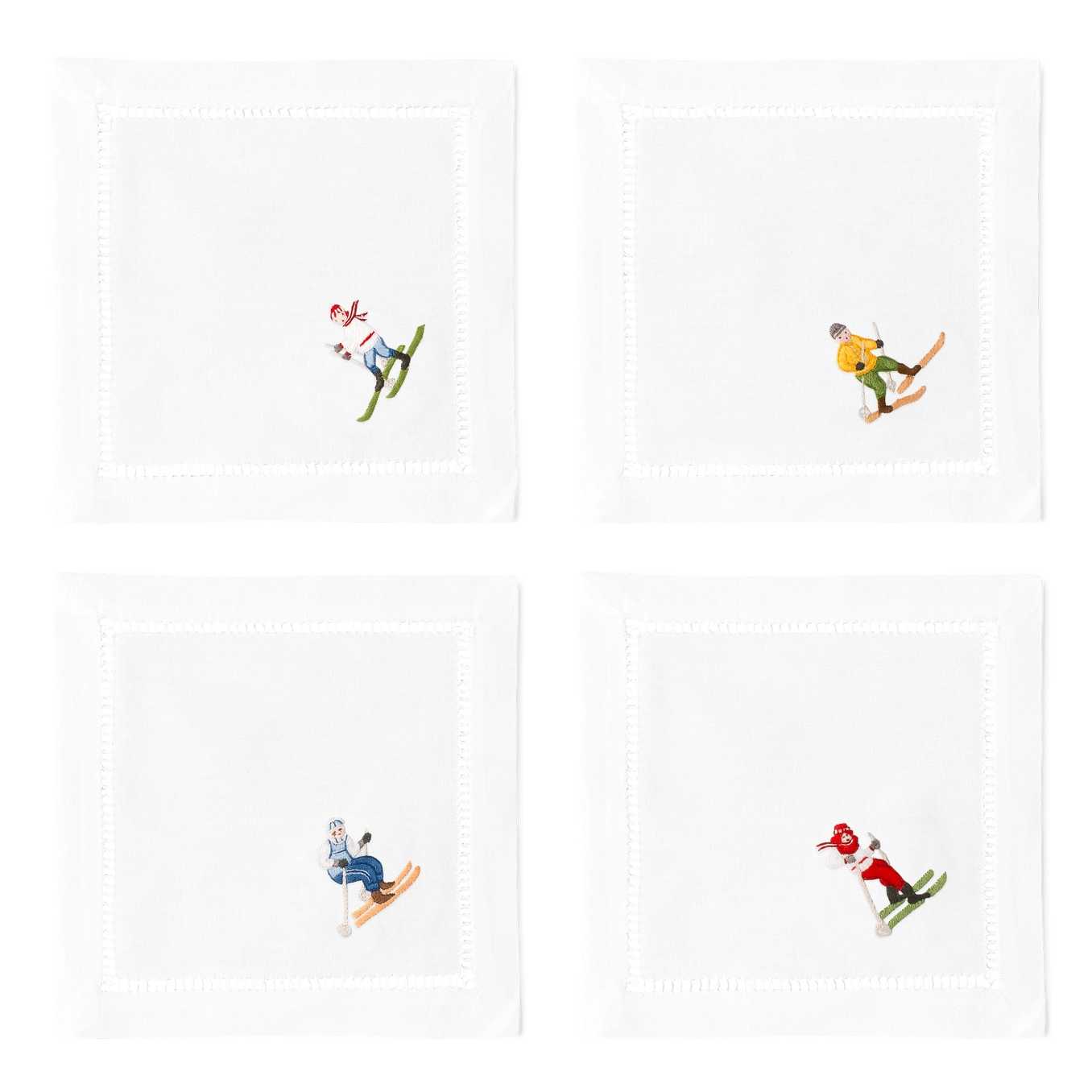 Elevate your entertaining with these exquisite hand-stitched and hand-embroidered cocktail napkins, each adorned with charming skier motifs. Meticulously crafted by hand, they bring refined elegance to any gathering. Whether hosting an intimate cocktail soirée or a winter celebration, these napkins serve as both functional essentials and conversation-starting décor pieces. Their artisanal quality and distinctive design make them an ideal choice for those who appreciate thoughtful, curated details in their home entertaining.
